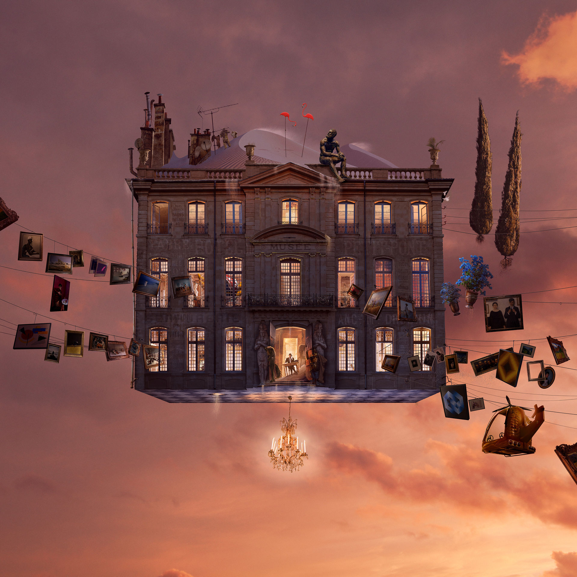 He defines his technique as artisanal. He begins by drawing a form, like a sculptor who begins his work with a rough sketch. He then photographs and searches through his vast image library for fragments of facades, roofs, gutters, dirt, graffiti, chimneys, windows, tiles, reflections, frost, statues, typography, rust, drips, shadows, antennas, satellite dishes, snow, and traces of time. Interiors are photographed separately with the meticulousness and attention to detail of a theater set designer. He tries on curtains, tapestries, lighting fixtures, furniture, and toys. Famous people are found on the internet and then retouched because the images are too poor quality to be used. He is forced to photograph a model and reconstruct a face with a satisfactory complexion. He draws inspiration from books and websites on the subject and adds light reflections to the eyes. Sometimes he has to make part of the flying house as a model, then paint it to achieve the desired light reflections. He might start a work with daylight and decide, after six months of editing, to create evening light… this involves changing all the light returns on the facade, the figures, etc. He might also decide it's snowing and everything needs to be changed. It's a permanent work in progress. These works are never finished; it's a definitive word whose meaning he tries to ignore. He might add scenes years later… like a building changing hands. He doesn't try to move quickly; his process takes time, time to explore all possible ideas, time to open all the drawers of a huge piece of furniture… with drawers.